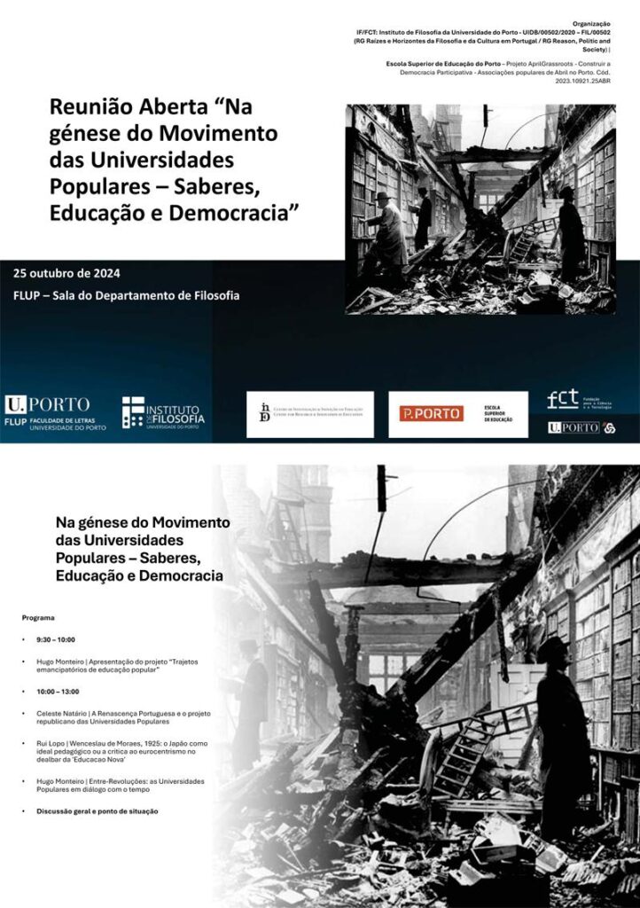 A Reunião Aberta “Na génese do Movimento das Universidades Populares – Saberes, Educação e Democracia” realizou-se no dia 25 outubro de 2024, com início pelas 9h30 no departamento de Filosofia da Faculdade de Letras da Universidade do Porto. Esta reunião aberta contou com os contributos de Hugo Monteiro, Celeste Natário e Rui Lopo, na qual foram abordados temos relacionados com a educação popular, a Renascença Portuguesa e o projeto republicano das Universidades Populares e ainda a obra e estudo de Wenceslau de Moraes acerca do Japão como ideal pedagógico.