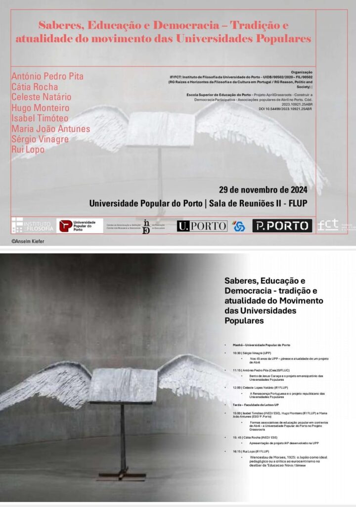 No dia 29 de novembro de 2024, o Instituto de Filosofia da Universidade do Porto, em colaboração com o inED da Escola Superior de Educação do Porto e com a Universidade Popular do Porto (UPP), realizou um seminário intitulado “Saberes, Educação e Democracia – Tradição e atualidade do movimento das Universidades Populares”. O evento reuniu investigadores e líderes do movimento das universidades populares para discutir a importância histórica e contemporânea destas instituições na promoção de uma educação inclusiva e democrática. O programa do seminário esteve dividido em duas sessões: a manhã foi realizada na UPP e foi discutida a génese do projeto nos 45 anos da Universidade Popular do Porto, seguido por palestras sobre Bento de Jesus Caraça e a Renascença Portuguesa. À tarde, na Faculdade de Letras da Universidade do Porto, foi apresentado o projeto AprilGrassroots e foram discutidos temas relacionados com o associativismo e a educação popular, assim como sobre o eurocentrismo na educação.