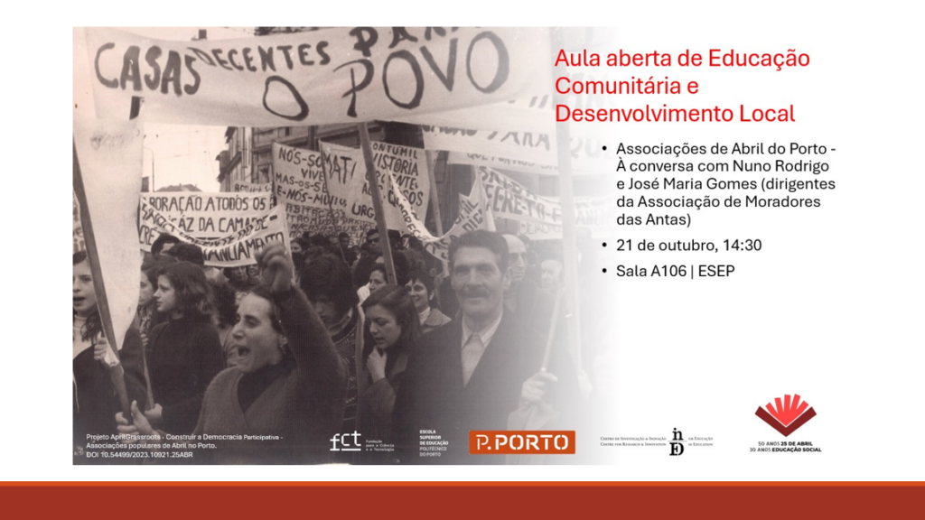 No dia 21 de outubro de 2024, pelas 14h30, realizou-se na Escola Superior de Educação do Porto (ESE) uma aula aberta de Educação Comunitária e Desenvolvimento Local, da Licenciatura em Educação Social, com Nuno Rodrigo e José Maria Gomes, dirigentes da Associação de Moradores das Antas.. Revisitou-se a génese da constituição da associação, e o papel crucial das associações de moradores na construção da democracia participativa em Portugal e na luta pelo direito à habitação, com especial destaque para o Projeto SAAL. A aula fez parte das atividades desenvolvidas no âmbito do projeto AprilGrassroots, que se dedica a investigar e divulgar a história das associações populares nascidas após a Revolução de Abril de 1974. Integrou ainda as comemorações dos 30 anos de Educação Social e dos 50 anos do 25 de Abril.
