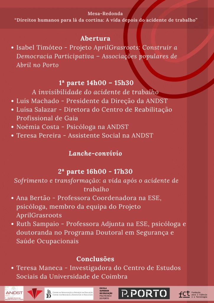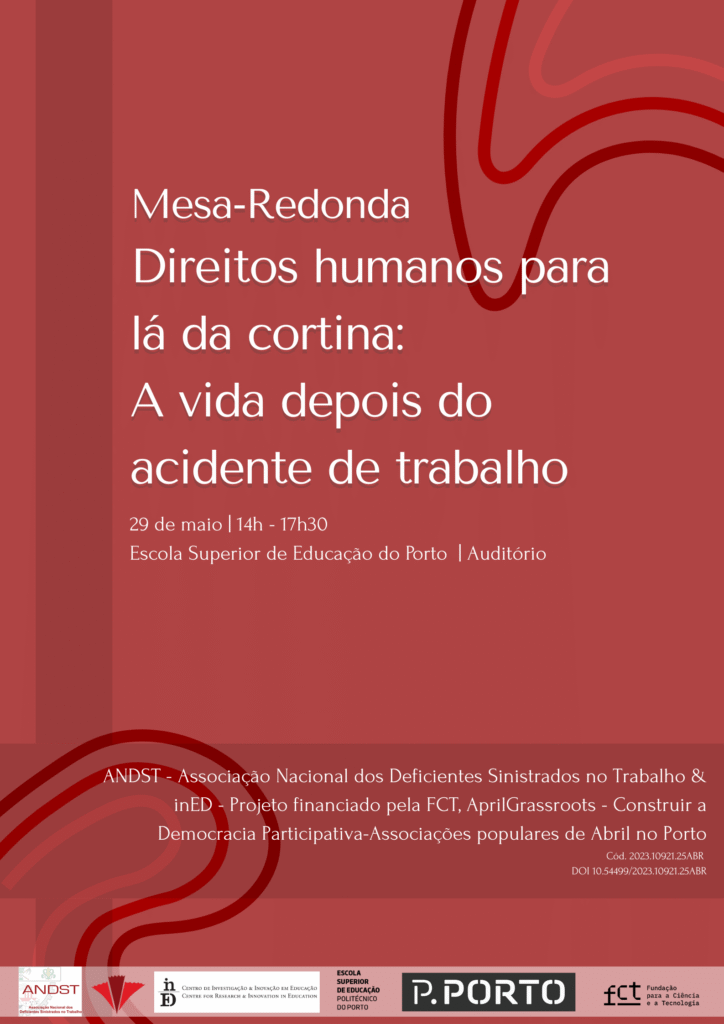 No próximo dia 29 de maio, pelas 14h, no auditório da Escola Superior de Educação será realizada uma Mesa-Redonda intitulada “Os direitos humanos para além da cortina: A vida depois de um acidente de trabalho”. Esta é organizada pelo projeto de investigação “Construir a Democracia Participativa – Associações Populares de Abril no Porto” e pela ANDST (Associação Nacional dos Deficientes Sinistrados no Trabalho), que é uma das associações parceiras deste projeto.