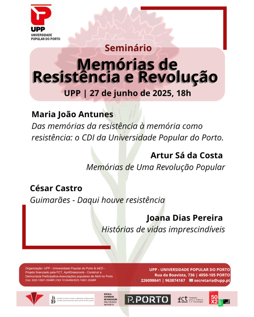 Numa parceria entre a UPP – Universidade Popular do Porto e a Escola Superior de Educação do Instituto Politécnico do Porto, vai realizar-se na UPP, em 27 de junho de 2025 às 18h, o Seminário “Memórias de resistência e revolução” – uma apresentação e discussão