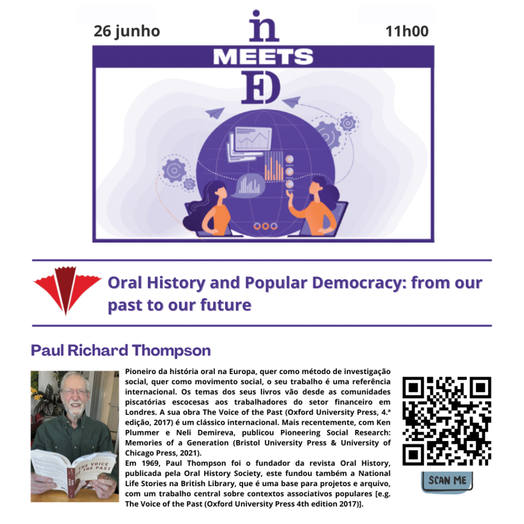 No dia 26 de junho de 2025, pelas 11h, Paul Thompson, referência incontornável na área da história oral e fundador da Oral History Society, realizou o workshop “Oral History and Popular Democracy: from our past to our future”, na Sala Ágora (Biblioteca da Escola Superior de Educação do Porto), também com transmissão online.